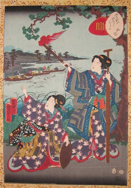 Сестры подают сигнал лодкам об отмели, художник Кунисада
