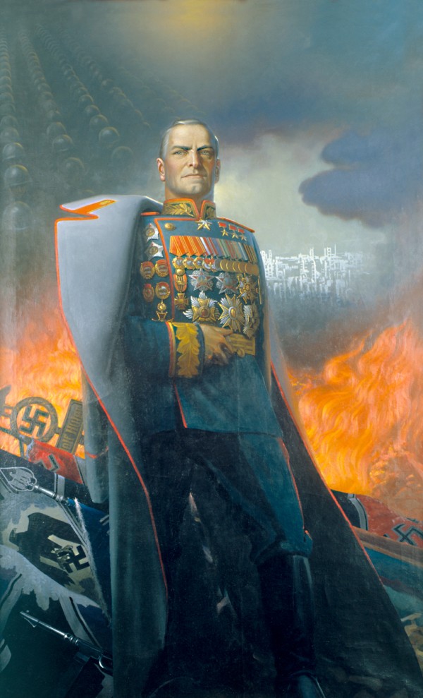 Сущность Георгия Жукова лучше всего передаёт портрет работы Константина Васильева. На картине вообще не человек, это бог войны и смерти, огня и крови, с волчьим оскалом на синем лице упыря. Шинель словно отлита из негнущейся стали, холодным тусклым золотом, болотным ведьминым огнём светятся тарелки орденов, за спиной корчатся багрово-золотистые языки подземного огня, и жутко белеет скелет какого-то здания. Возможно, маршал Жуков по количеству пролитой им крови и шлейфу самолично вынесенных смертных приговоров за спиной в определенные годы превосходит даже Сталина. Жестокость этого садиста испытали многие, Жуков не знал и не хотел знать границ своей власти, он явочным порядком присваивал себе власть. А о его мародерстве ходят легенды, после Победы своё наворованное добро эшелонами оправлял к себе домой.
