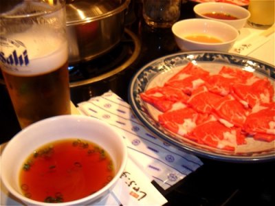 - японское блюдо из говядины с овощами и тофу, вареными в кипящем бульоне. Говядину или телятину режут просвечивающими на свет ломтиками и бросают в кипящий бульон с разными овощами и грибами. Время приготовления — 1—2 минуты. Затем следует вынуть палочками ломтик мяса и обмакнуть его в плошку с сырым яйцом, размешанным все с тем же соевым соусом. Порезанная на ломтики толщиной с лист бумаги говядина, опущенная кусочек за кусочком в бульон в простой кастрюле и обмокнутая в соус — это блюдо сябу-сябу, одно из самых известных в Японии, наряду с сукияки, кушаньем из мяса и овощей. Мраморная говядина, имеющая сеть из тонких волокон жира, считается в Японии деликатесом, причем вкуснее всего она получается в сябу-сябу. Знатоки предпочитают немного недоваренное мясо — оно практически тает во рту.