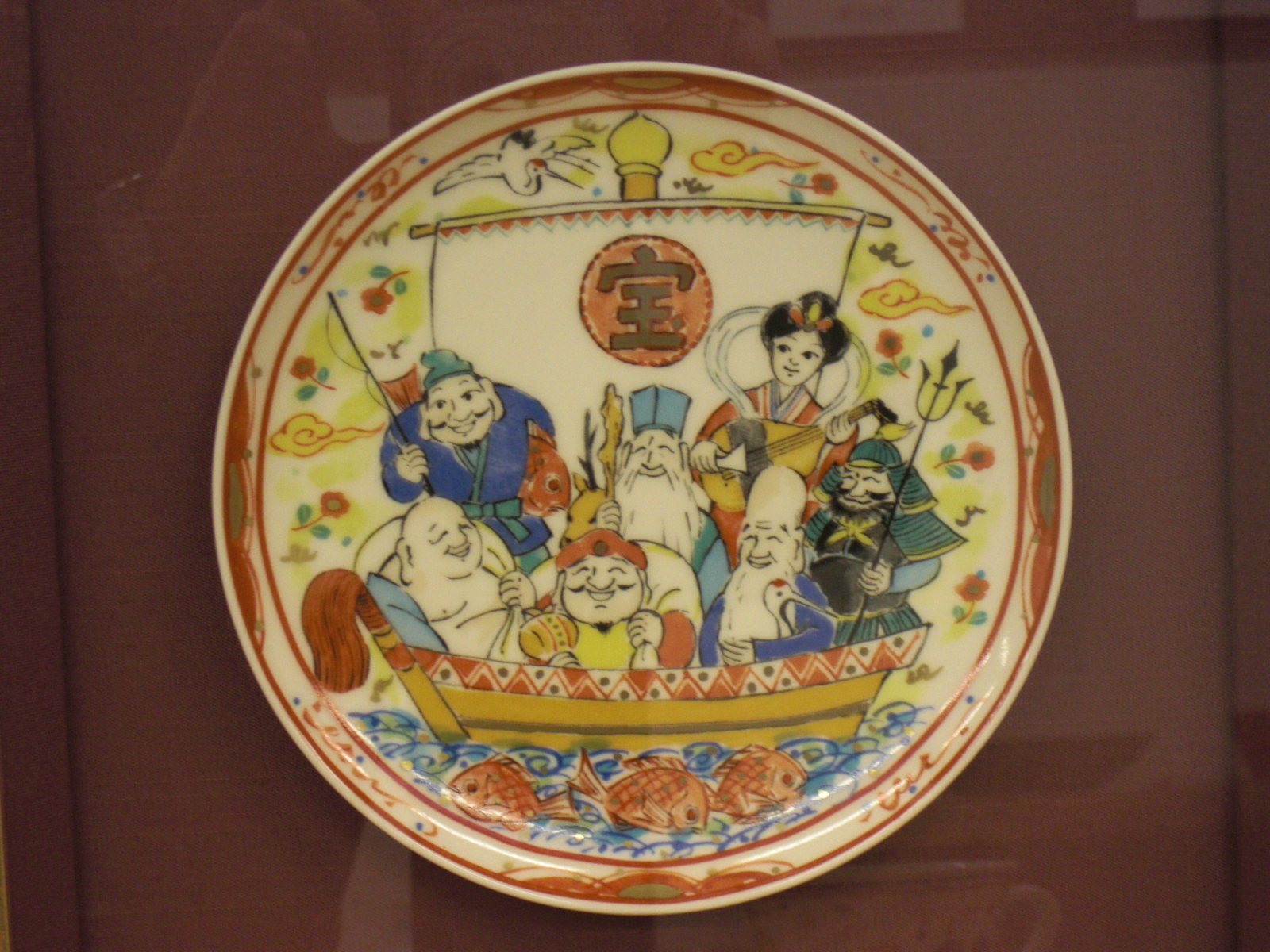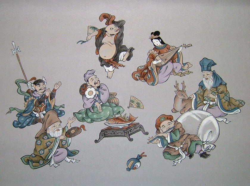 Ситифукудзин (Shichifukujin) - это семь богов удачи, эклектичная группа божеств из Японии, Индии и Китая. Считается, что только Эбису родом из Японии и попал из синто традиции, но и он чужак. Трое богов из индо-буддийского пантеона Индии - Дайкоку (Daikokuten), Бисямон (Bishamonten) и Бензайтен (Benzaiten). Три бога попали из китайской даосской и буддийской традиций - Хотэй (Hotei), Дзюродзин (Jurōjin) и Фукуродзю (Fukurokuju). Эти семеро китайских мудрецов из бамбуковой рощи приплыли в Японию на корабле Такарабунэ в XV веке в канун Новогодних праздников, их волшебный корабль сокровищ вошел в порт и высадил недалеко от Киото на берег Ситифукудзин семь богов счастья. Каждое божество существовало независимо друг от друга, прежде чем в Япония из них искусственно создали компанию собутыльников. Происхождение этой группы является неясным, хотя большинство ученых указывают на эпоху Муромати (1392-1568). Сначала члены группы не были закреплены и их было меньше семи, Бензайтен была включена позже. Входила в группу и богиня Kichijten, она пришла из индийской мифологии, это индуистская Лакшми, богиня счастья, плодородия и красоты. Позже Kichijten заменил Дзюродзин, по другим данным - Фукуродзю. С 15-го века Ситифукудзин получила популярность, особенно среди городских купцов и ремесленников, как благоприятный знак и мотив счастья и долголетия. По некоторым данным эта популярная группа божеств напоминает о китайских семи мудрецов бамбуковой рощи и/или семи мудрецов чаши вина, образы которых очень популярны в Китае, в Японии же группа создана искусственно в 17-ом веке монахом Тенкай ( Tenkai, 1536-1643), который хотел, чтобы они символизировали основные добродетели человека во время правления сегуна Токугава Иэмицу (1623 - 1650). В дао семь добродетелей включают долголетие, богатство, известность. искренность, дружелюбие, достоинство, и великодушие. Интересно сравнить эти добродетели с христианскими, которые сформировал в своих трудах Фома Аквинский и другие богословы. Семь христианских добродетелей включают целомудрие, умеренность, справедливость, щедрость, надежда, смирение и вера. Либо благоразумие, вера, любовь, мужество, надежда, справедливость и умеренность. Лишь к 19 веку состав компании мудрецов устоялась в нынешнем составе.