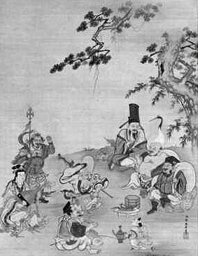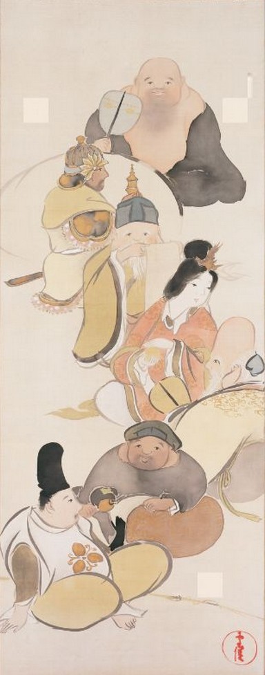 Это наиболее раннее из сохранившихся живописных изображений всех семи богов удачи, то есть стандартный набор. Свиток нарисовал художник Кано Ясунобу (1613 - 1685), хотя у его брата Кано Таню (1602—1674) тоже есть подобный свиток из шелка, но там всего пять богов. Художник Кано Ясунобу разместил семь мудрецов на открытом воздухе, под соснами, одетыми в одежду высших классов при оживленной попойки, в которой участники играют на музыкальных инструментах, танцуют и поют. Состав собутыльников дает возможность предположить, что используется канон академических художников династии Мин в их изображении Восьми даосских Бессмертных, такие картины, вероятно, были импортированы в Японию в этот период.