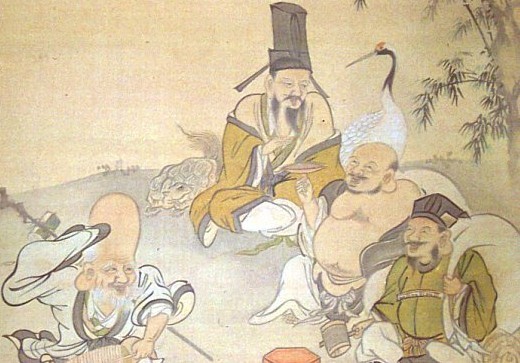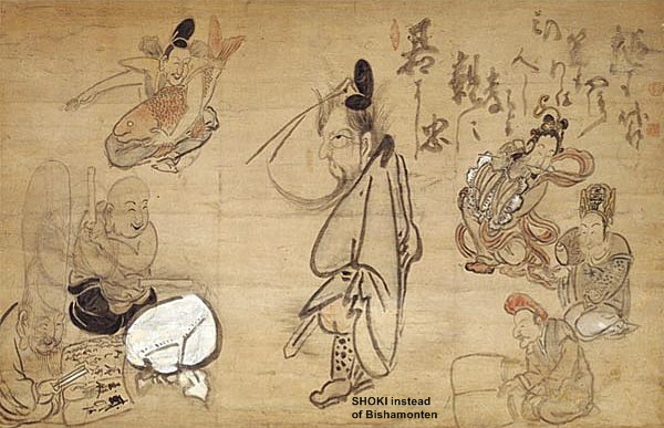 Один из старейших сохранившихся рисунков богов удачи, как видим, их здесь пять. Эбису с рыбой, Дайкоку с тюком риса, Бисямон с длинным копьем, а Бензайтен с музыкальным инструментом, Последний - Хотэй.