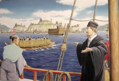Луи Фруа встречается с Мураками Мотоеси. Иезуиты, как и все путешественники, платили подать за передвижение по территории Мураками. На заднем плане видна крепость на острове Носима.