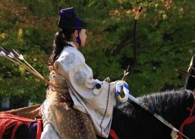 Ябусамэ (Yabusame) - ритуальная конная стрельба из лука, ритуал синто, а не спортивное мероприятие. Это церемония синто, проводимая для отпугивания злых духов и гадания, и упражнение в стрельбе из лука кюдзюцу с коня по мишеням. Ритуал включает 4 элемента - сначала руководитель группы стрелков, которых может быть 7, 10 или 16, выпускает стрелу в небо и в землю для установления вечного мира между ними; затем стрелки по очереди на полном скаку выпускают стрелы по трем квадратным мишеням со стороной ок. 60 см, установленным в ряд на расстоянии ок. 46 м одна от другой и на удалении ок. 2 м от скаковой дорожки; участники, поразившие все 3 мишени, допускаются к стрельбе по трем "бычьим глазам", изготовленным из глины в виде шариков диаметром ок. 9 см; после этого мишени подносятся руководителю для осмотра. Стрельба ведется стрелами со свистульками вместо наконечника, которые своим гудением должны отпугнуть злых духов. По тому, под каким углом стрела попала в мишень, предсказывают будущее. Ябусамэ как боевое искусство помогало самураям учиться концентрации, дисциплине и самосовершенствованию. Дзэн, сильно повлиявший на ритульную стрельбу, учит методам стабилизации и успокоения ума и тела, даря практикующему ясность ума и дальнейшие направления действия. Чтобы иметь возможность натянуть тетиву, прицелиться и сделать точный выстрел в пылу сражения, самурай должен был уметь справляться с собственной тревогой и лишними мыслями.