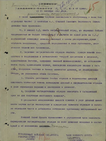 Приказ о создании заградотрядов. Подписан Георгием Жуковым.