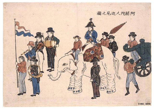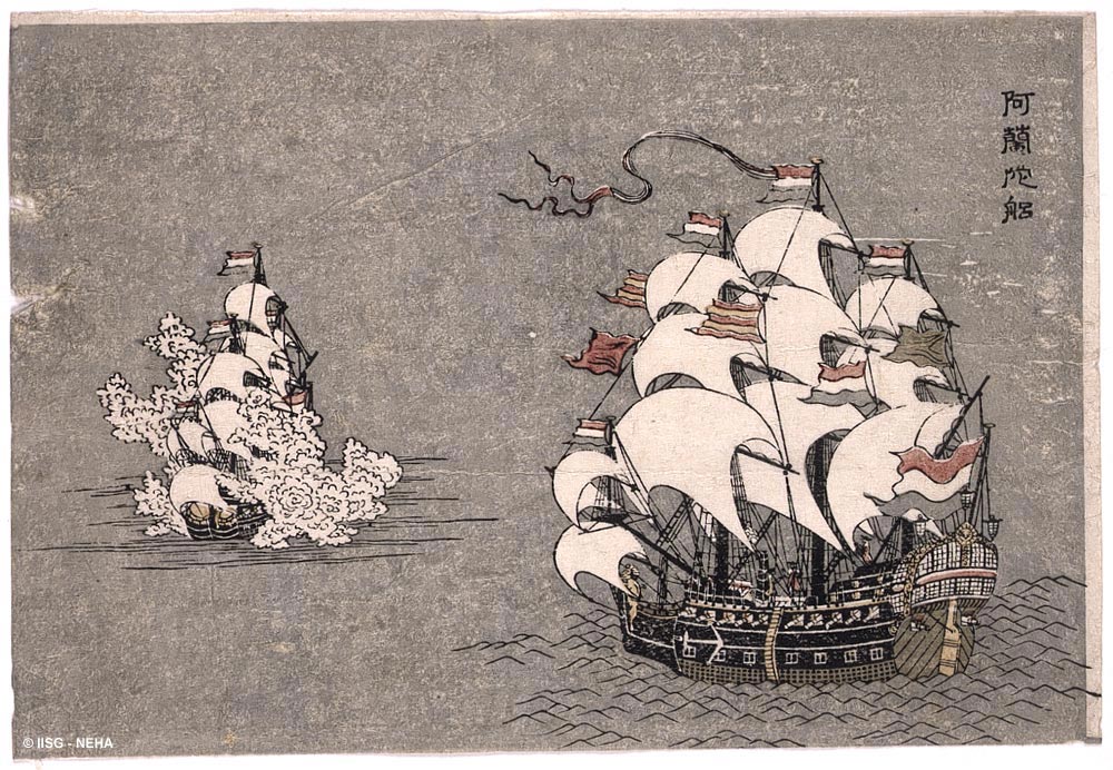Рыжеволосые варвары С 1630-х годов до середины девятнадцатого века Япония была практически закрыта для иностранцев. Нагасаки был единственным японским портом, открытым сёгунатом Токугава для торговли с заграницей в период изоляции страны. Единственный контакт с европейцами был сохранён через Голландскую Восточно-Индийскую торговую компанию. Японцы насыпали специальный искусственный остров Дедзима в гавани Нагасаки. Представленные здесь гравюры представляют собой ранний период в искусстве японской гравюры на дереве. Изготовлены они были в период между 1800 и 1865 годами как сувениры и проданы голланду, который посетил Нагасаки. Сейчас хранятся в Международном институте социальной истории в Амстердаме. Европейские корабли, животные, которых привозили в Японию, вызывали у японцев много удивления и восхищения. Сами иностранцы, и в первую очередь голландцы, изображаются бледными, уродливыми рыжеволосыми варварами с большими носами.Каждый год один-два голландских корабля прибывали в Нагасаки для сбора и доставки товаров, а также замены сотрудников торгового поста. Прибытие кораблей было событием в обычной жизни на острове Дедзима. Корабли украшались флагами и были очень красочны. Особенно впечатляющими было скорости, с которой опускали и поднимали паруса, и мощные пушки, которые охватывали корабль в дым, когда производили салют.