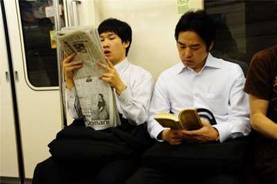 Смотришь в окно - и кажется, что земля покрыта до горизонта огромными зеркалами, но на самом деле это у фермеров началась весенняя страда, пора высаживать рис. Мне, конечно же, не удалось поймать момент и запечатлеть бескрайние зеркальные поля. У меня была лишь одна возможность снять что-нибудь похожее на те поля, что я видел 5 минутами назад, но поезд мотнуло, и я со все дури долбанул себя камерой по лбу. После этого я молча вернулся на место, достал книгу и читал ее до самого Киото. А вот как раньше выращивали рис у нас в Ниигате. Адский труд, должен сказать. Когда сделал пересадку на другой поезд в Канадзаве, ко мне подсел тучный японец в дорогом костюме с ролексом на левой руке. Чувак довольно вольготно развалился в кресле, немного нарушив границы моего личного пространства, что было странно, так как японцы обычно наоборот стараются отодвинуться от меня подальше (не пойму, что их так смущает - АК-47 на плече или дрессированный медведь на поводке).