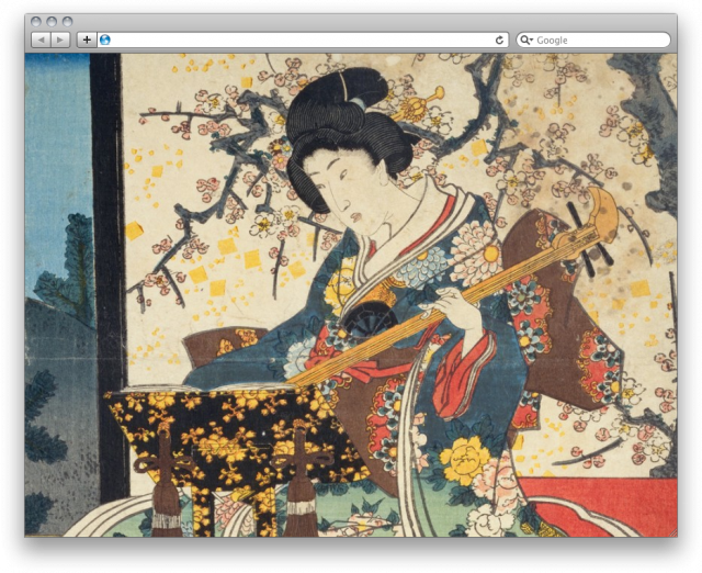 Эта нисике-э (японская многоцветная ксилография) входит в серию из 12 гравюр, изображающих ежегодные мероприятия и жизнь людей в разные времена года с января по декабрь. Моделями для этих гравюр начала XIX века были красавицы из Эдо (современный Токио). На этой гравюре, изображающей яркое веселое зрелище, символизирующее Новый год, представлен январь. Название написано в верхнем левом углу. На гравюре показаны две девушки, впервые исполняющие танец Нового года под аккомпанимент сямисэна. Танец называется "Харукома", он выражает пожелание здоровья и благополучия на весь год. Обе танцовщицы держат игрушечную голову лошадки и шарф, символизирующий уздечку. На их кимоно с длинными рукавами нанесен узор в виде ржанок, живущих на мелководье птиц, которые с древних времен являются символом зимы в Японии. На красную ткань нижнего одеяния нанесен узор из конопляных листьев, получивший в то время широкое распространение, так как конопля считалась сильным быстро-растущим растением. На черных поясах оби – узор из волнистых завитушек. На стоящих позади ширмах изображены молодые сосны и цветущее дерево умэ (японская слива). Сосна обладает большой жизненной силой и символизирует благополучие, а цветы умэ, распускающиеся в самое холодное время года, являются символом Нового года в Японии. Читать дальше