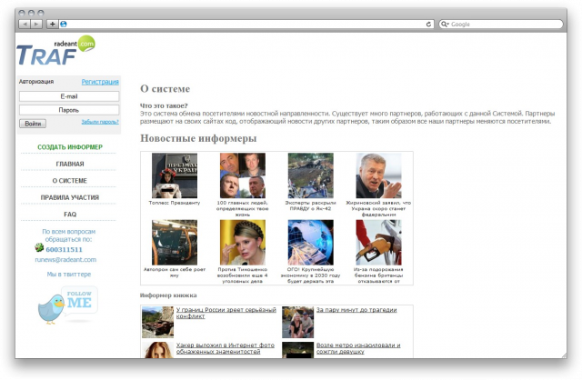Radeant - сервис обмена трафиком. Это система обмена посетителями новостной направленности. После регистрации вы автоматически становитесь её партнером, используя обменную сеть вы сможете увеличить посещаемость вашего сайта. Партнеры размещают на своих сайтах код, отображающий новости других партнеров, таким образом все участники сети меняются посетителями. К участию на ресурсе допускаются качественные сайты, прошедшие модерацию. Участники сети обмениваются переходами (кликами) посетителей. После добавления сайта надо разместить информер сервиса у себя на сайте, информер - это блок состоящий из анонсов нескольких новостей (картинка + заголовок), который можно оформить под стиль вашего сайта. Вы устанавливаете специальный java-скрипт, на вашем сайте начинают транслироваться новости других участников обменной сети. Затем вы добавляете в сеть свои новости, ваша новость должна состоять из заголовка, короткого описания и картинки. Минимальное разрешение картинки 250 x 250 px. Сервис начинает показывать ваши новости на других сайтах-участниках обмена. Читать дальше