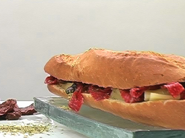 Описание материала:Большой бутерброд для утоления огромного голода. Состав:Багет — 1 штука;салями — 5 кусочков;сыр — 100 гр;несколько сушеных помидо;небольшое количество оливок;перец, соль, оливковое масло, орегано — по вкусу.
