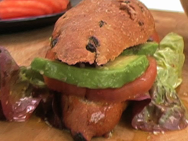 Описание материала:Вкусный салат в булочке с изюмом станет укрошением любого стола.Состав:булочки с изюмом — 3 штуки;авокадо — 1 штука;неколько листьев салата;лук — 1 штука;помидор — 1 штука;вишневый уксус, оливковое масло, перец, соль, зернистая горчица — по вкусу.