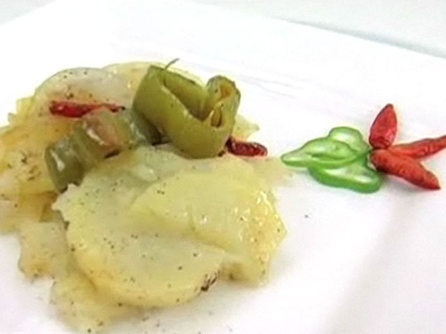 Рецепт вкусного гарнира из картофеля.Состав:картофель — 3 штуки;лук — 1/2 штуки;перец — 1 штука;чили, масло, перец, соль.