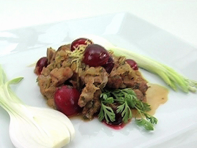 Описание материала:Традиционный рецепт баранины особенно выигрывает в сочетании с вишней и лимоном.Состав:баранья нога — 150 гр;вишня — 8 ягод;кориандр — 1 столовая ложка;цедра половины лимона;мясной бульон — 100 гр;чеснок — 1 зубчик;тмин — 1 чайная ложка;лук — 1 стручок;оливковое масло, перец, соль — по вкусу.